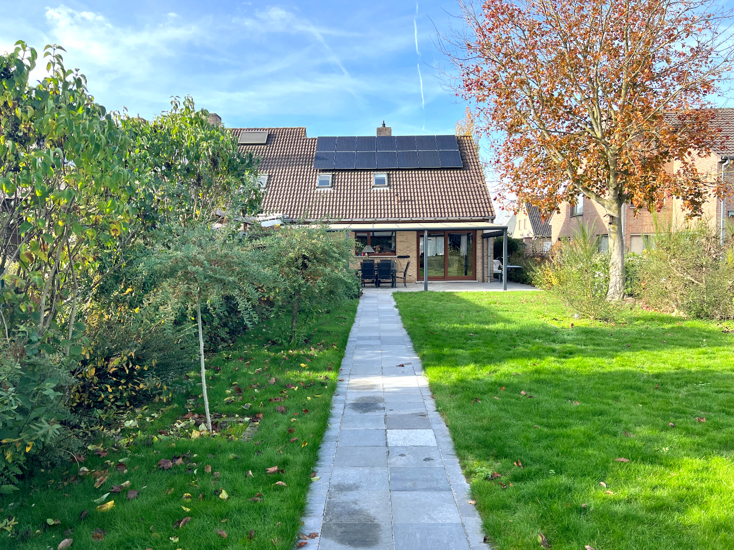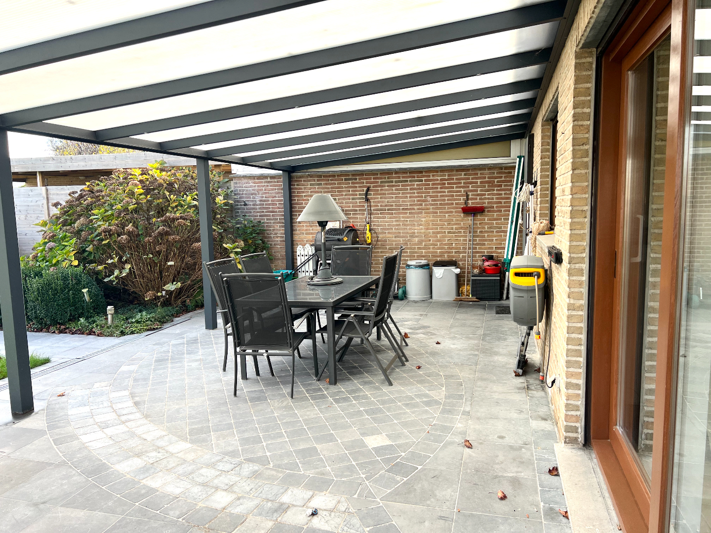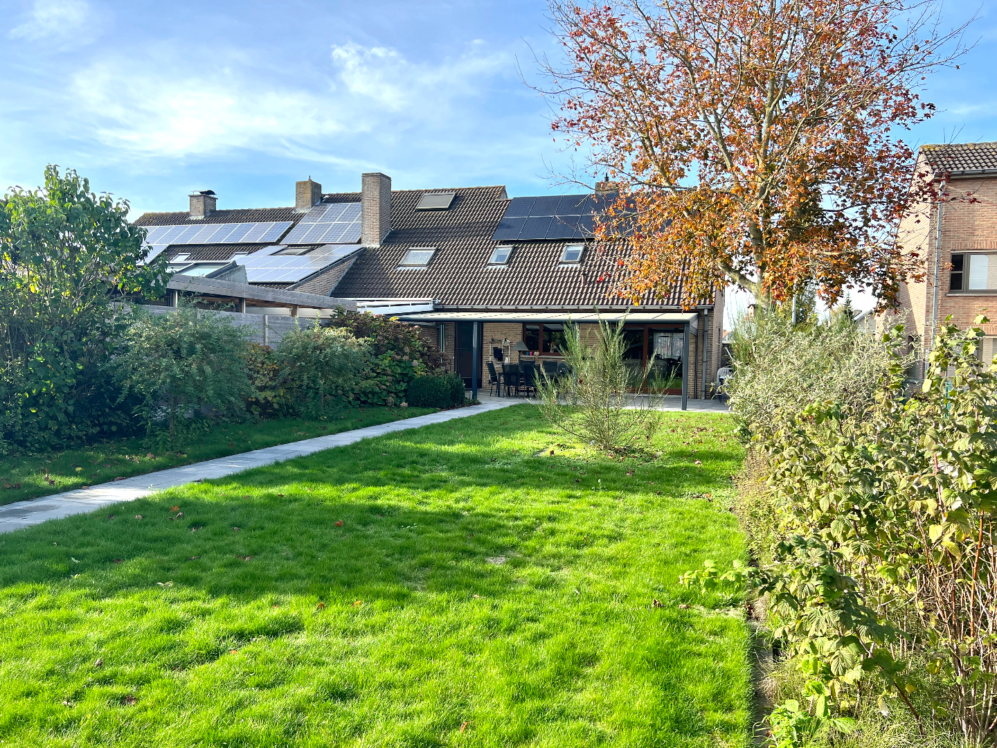 Komen we in de tuin terecht, heb je onmiddellijk een vakantie/thuisgevoel. Een groot overdekt terras om je tuinmeubilair te plaatsen, een mooi afgereden gazon, planten en een pad die leidt naar het knappe tuinhuis. Hier kan je echt je hartje bovenhalen om te genieten in je eigen tuin. Bovendien is er langs de zijkant van de woning een poortje voorzien zodat je zo met groenafval of andere zaken (zoals je fiets) niet doorheen je woning hoeft te gaan.
