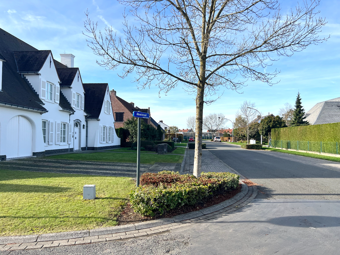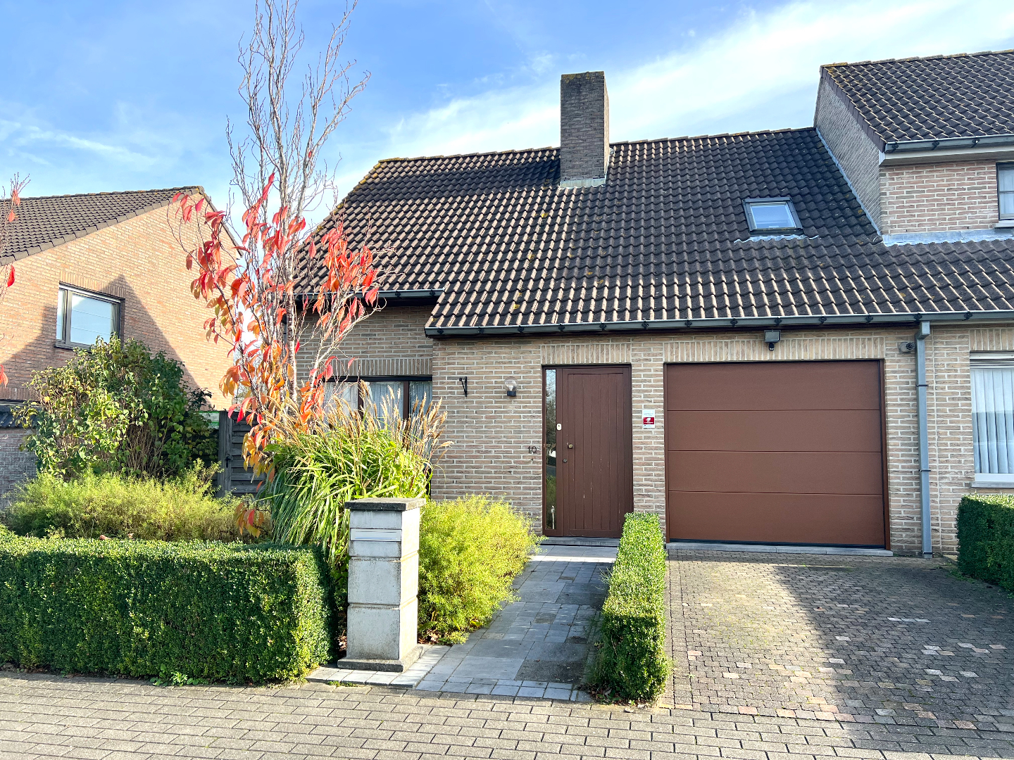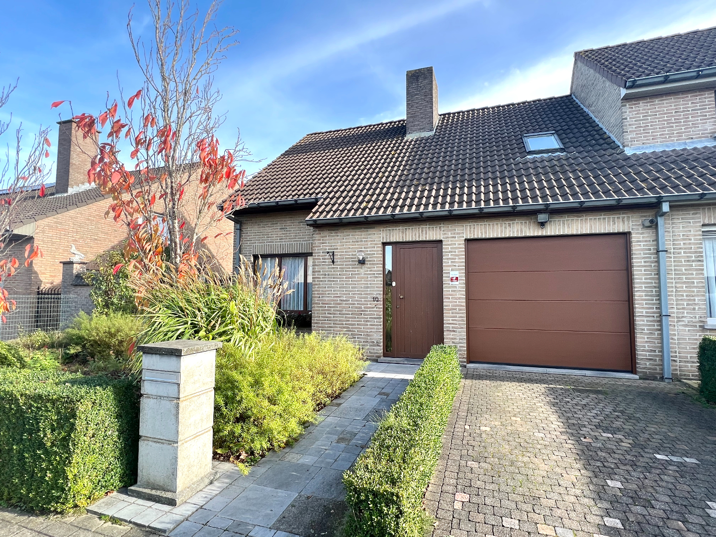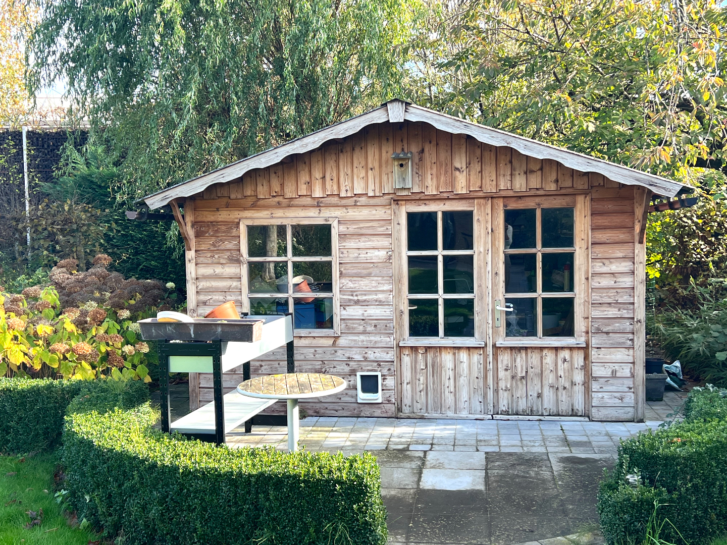 Komen we in de tuin terecht, heb je onmiddellijk een vakantie/thuisgevoel. Een groot overdekt terras om je tuinmeubilair te plaatsen, een mooi afgereden gazon, planten en een pad die leidt naar het knappe tuinhuis. Hier kan je echt je hartje bovenhalen om te genieten in je eigen tuin. Bovendien is er langs de zijkant van de woning een poortje voorzien zodat je zo met groenafval of andere zaken (zoals je fiets) niet doorheen je woning hoeft te gaan.