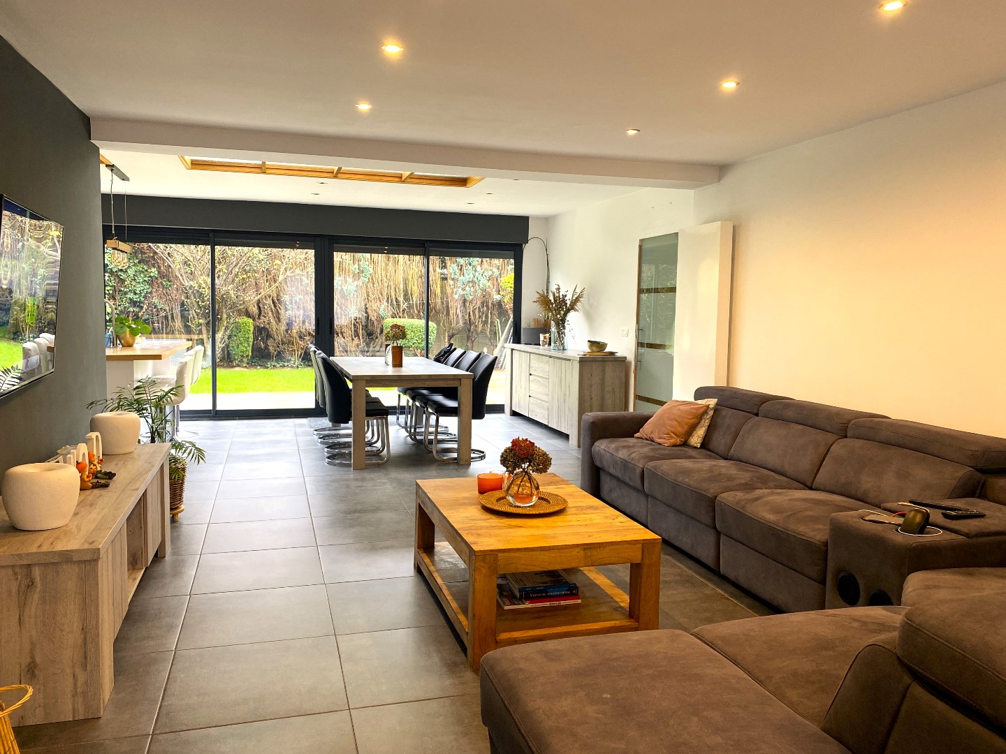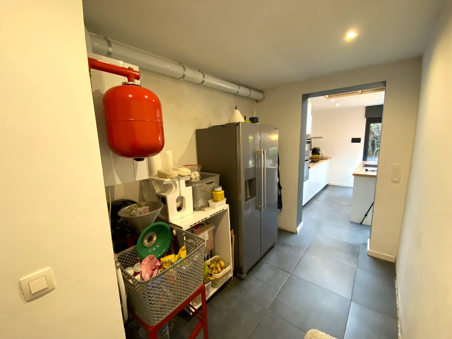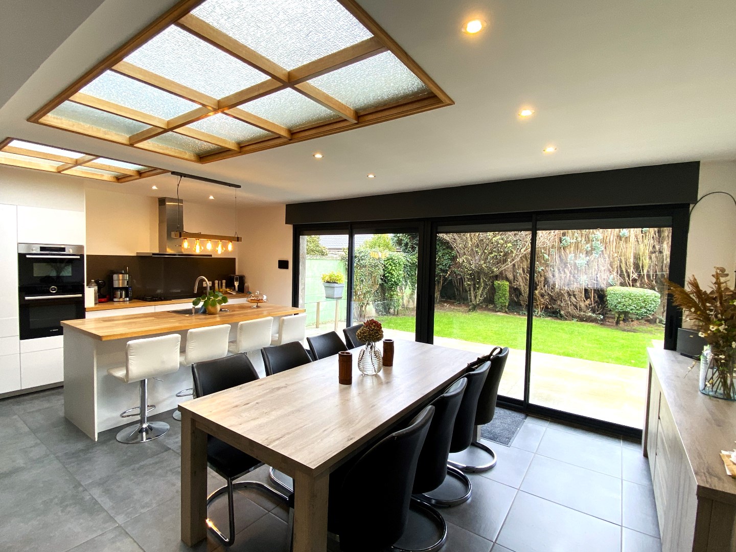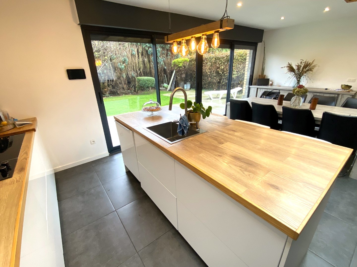 Extra troef zijn de parking voor de deur en garage voor 2 wagens. Via de inkomhal met gastentoilet komen we in de nette warme leefruimte met zicht op de tuin. De open volledig ingerichte keuken is het hart van de woning, de aansluitende bergruimte is een grote meerwaarde.