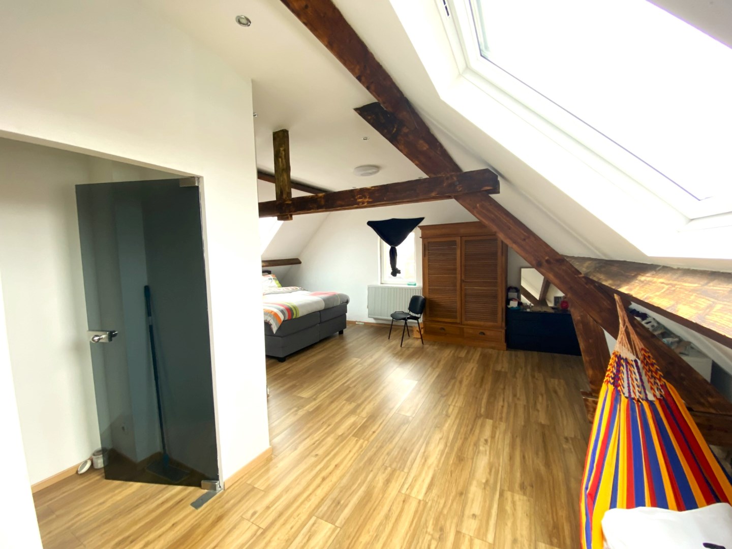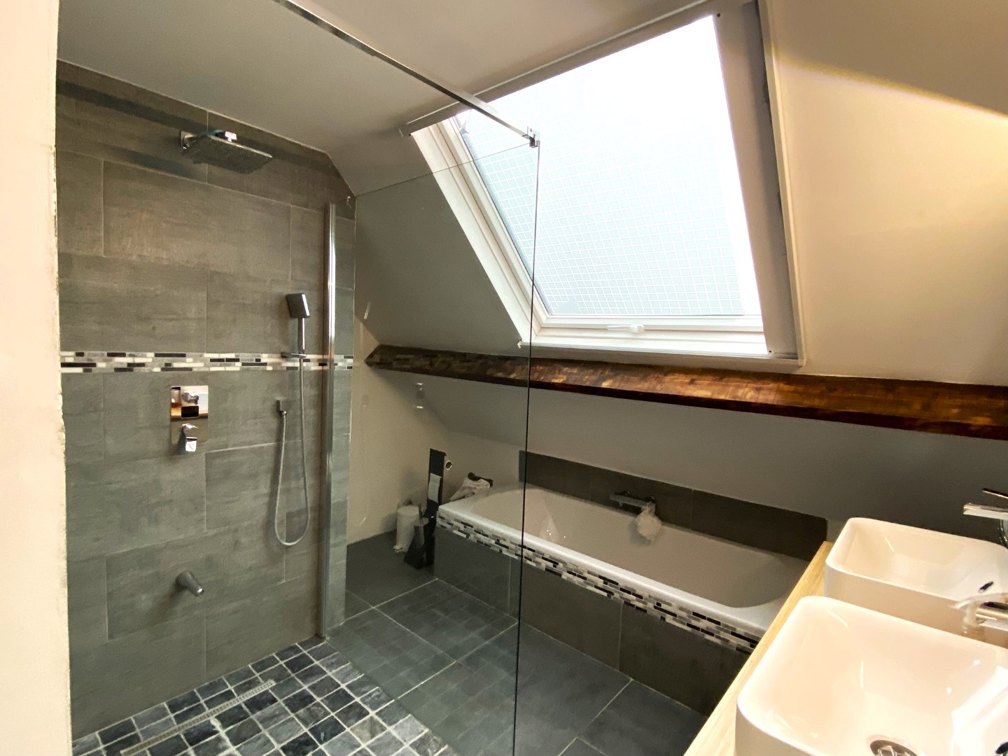 Op het eerste verdiep zijn er 2 slaapkamer, een bureau en een badkamer met toilet. Onder het dak op de 2e verdieping is er de masterbedroom met eveneens een badkamer met douche, toilet en bad. Men ziet dat de afwerking van een hoog niveau is, met oog voor detail en technologische snufjes. Een aanpalend terras zorgt ervoor dat de ruime stadstuin zeer gezellig is.